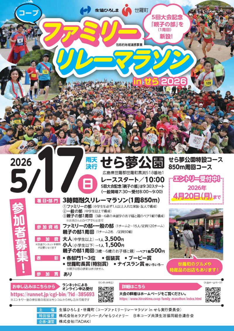 2026年5月17日(日)に第5回「コープファミリーリレーマラソンinせら2026」がせら夢公園特設コースで開催されます。ランニング経験豊富なランナーから、初めて大会に出るお子様まで、様々な走力の方が一本の襷(たすき)をつなぎ、チームみんなでゴールを目... -