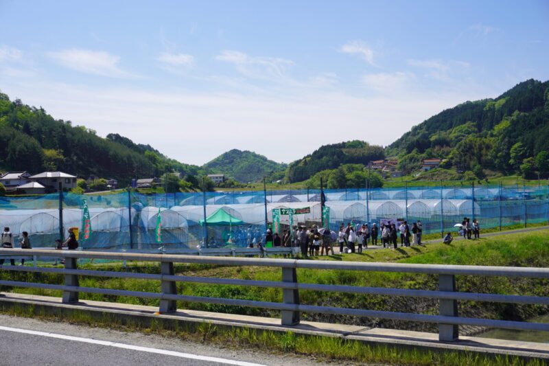 11時前に到着しましたが、会場周辺の駐車場は既に満車で、少し離れた「せらひがし小学校」の駐車場に駐車しました。小学校から眼下にアスパラガスのビニールハウスが広がっています!