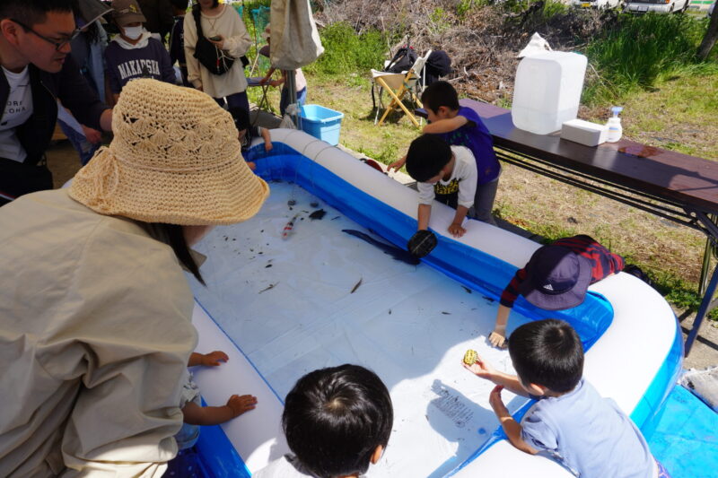 お祭りの会場では、新鮮なお野菜やポン菓子、川に生息する生き物の展示などがありました。