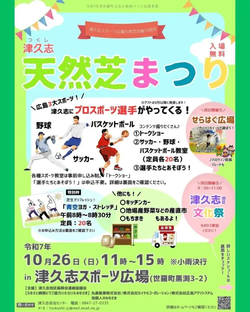 10月26日(日)、世羅町津久志地区で「津久志天然芝まつり」が開催します!津久志地区では、地域の皆さん、自治センターの職員の方々が維持管理する素晴らしい天然芝のスポーツ広場があります。その津久志スポーツ広場定植10周年を記念したお祭りが開催され... -