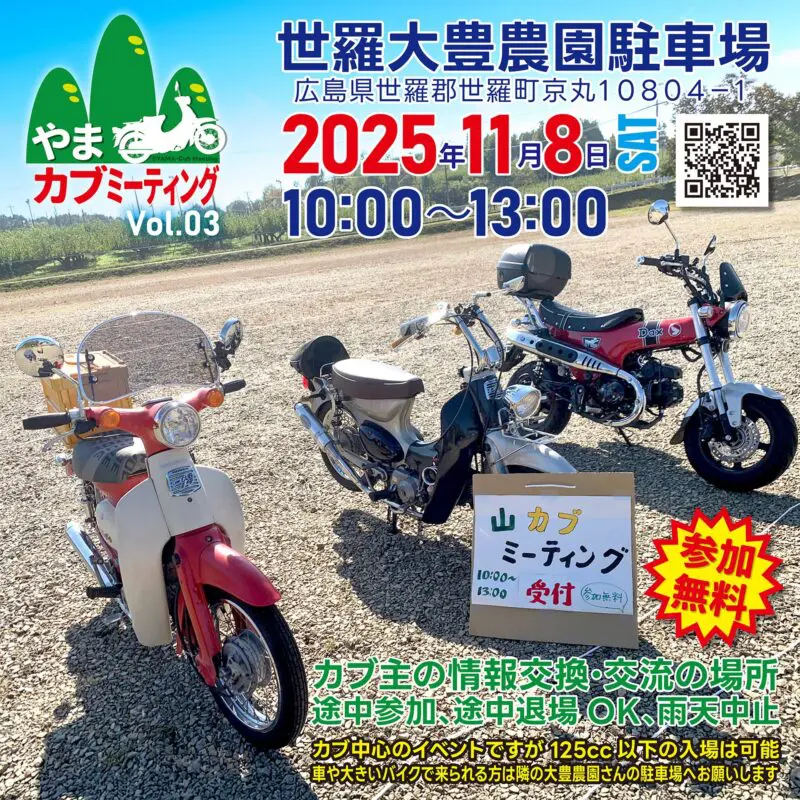 世羅町発のYoutuber、【Cub channel 58】さんが「第3回 山カブミーティング」を開催します!11月8日(土)、世羅町大豊農園が会場となります。カブを愛する方々の情報交換・交流の場所となります。前回第2回は約50台のカブが集合しました。多種多様なカブを... -