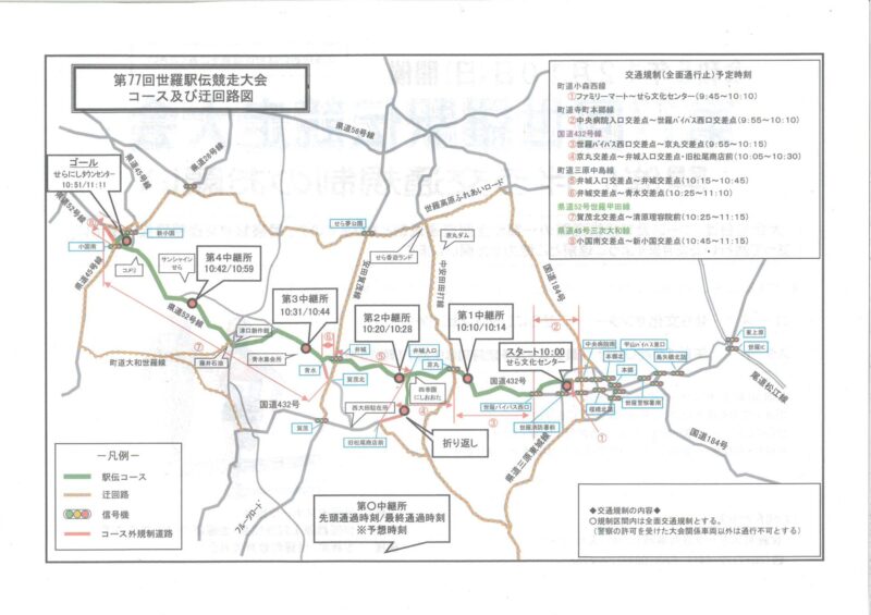 2023年12月10日(日)に世羅町スポーツ協会主催の世羅駅伝競走大会が開催されます。大会当日は、コース及び接続道路の一部が全面交通規制となりますので、警察官や交通規制整理員の指示に従って通行いただきますようご理解とご協力をお願いを致します。交... -