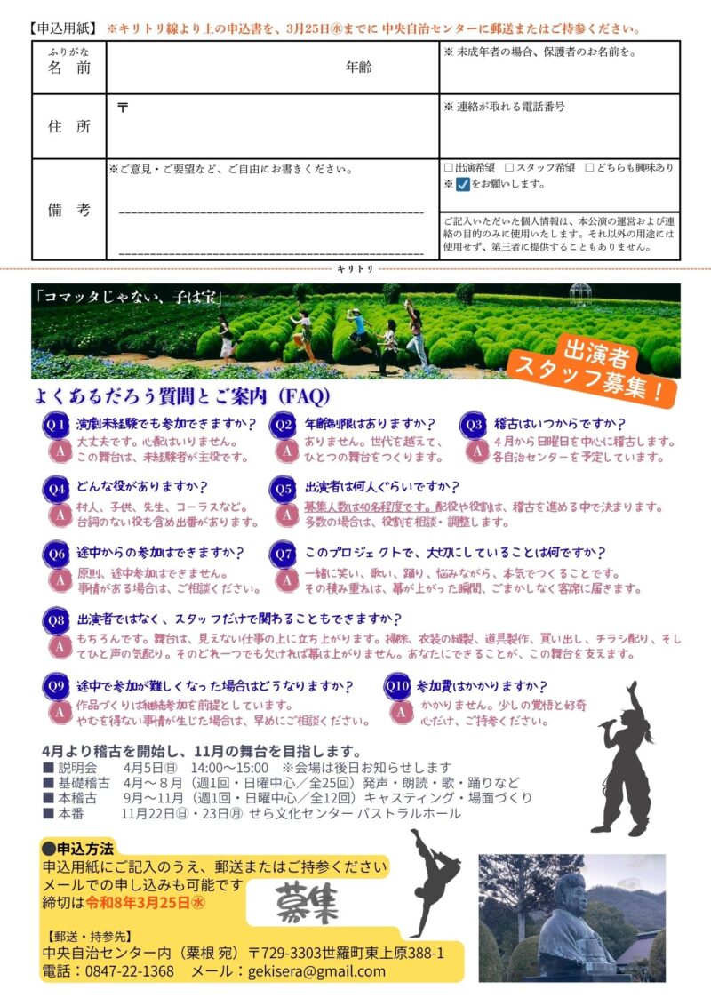 主催は『「演劇で人づくり」セラ実行委員会(げきセラ)』で、現在、出演者・スタッフの募集を開始しました。