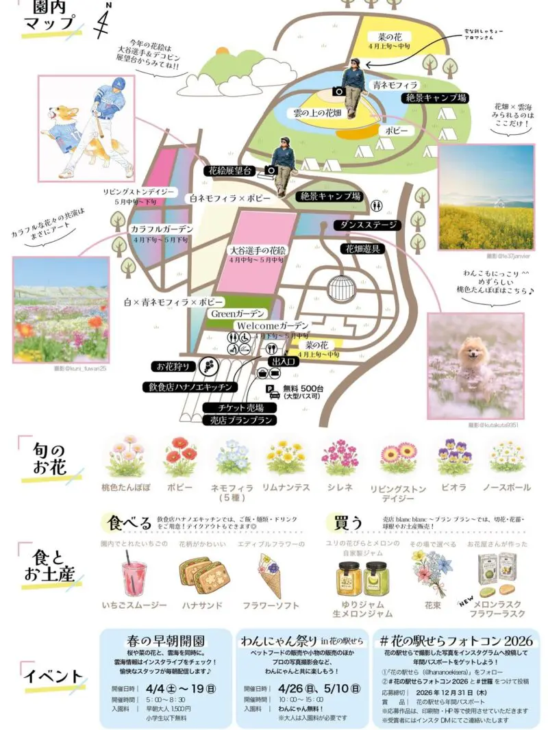 | 入場料 | <大人>1,000円 <小人(小学生・未就学児)>無料 ※ただし、開花状況により変動します <障害者割引>半額(障害者手帳をご提示下さい) <団体割引>1割引(15名以上) |