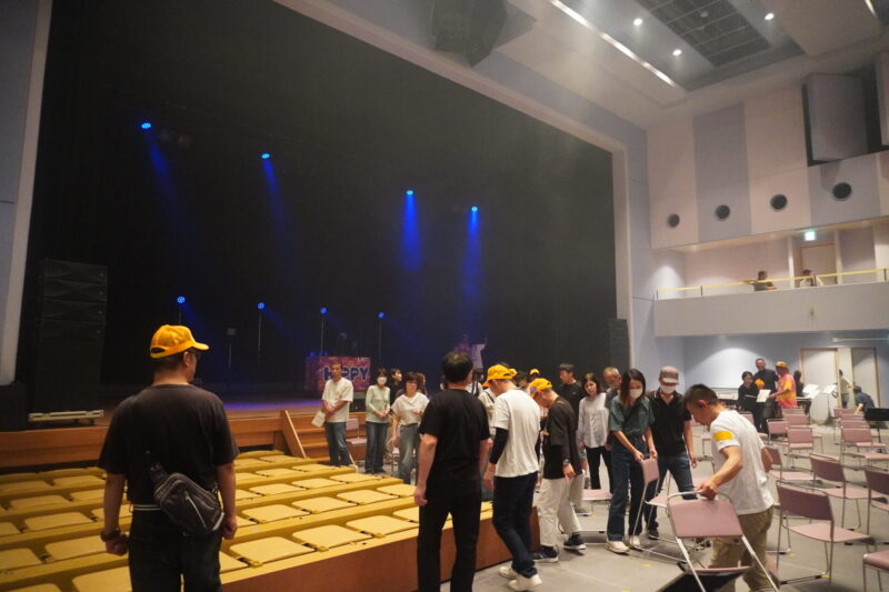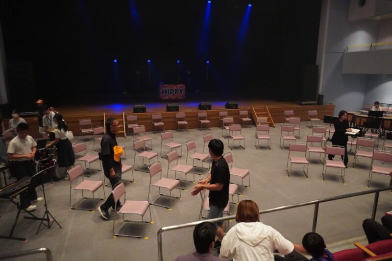 ステージ前の客席を急遽片付けて、子供たちの演奏準備を行います。