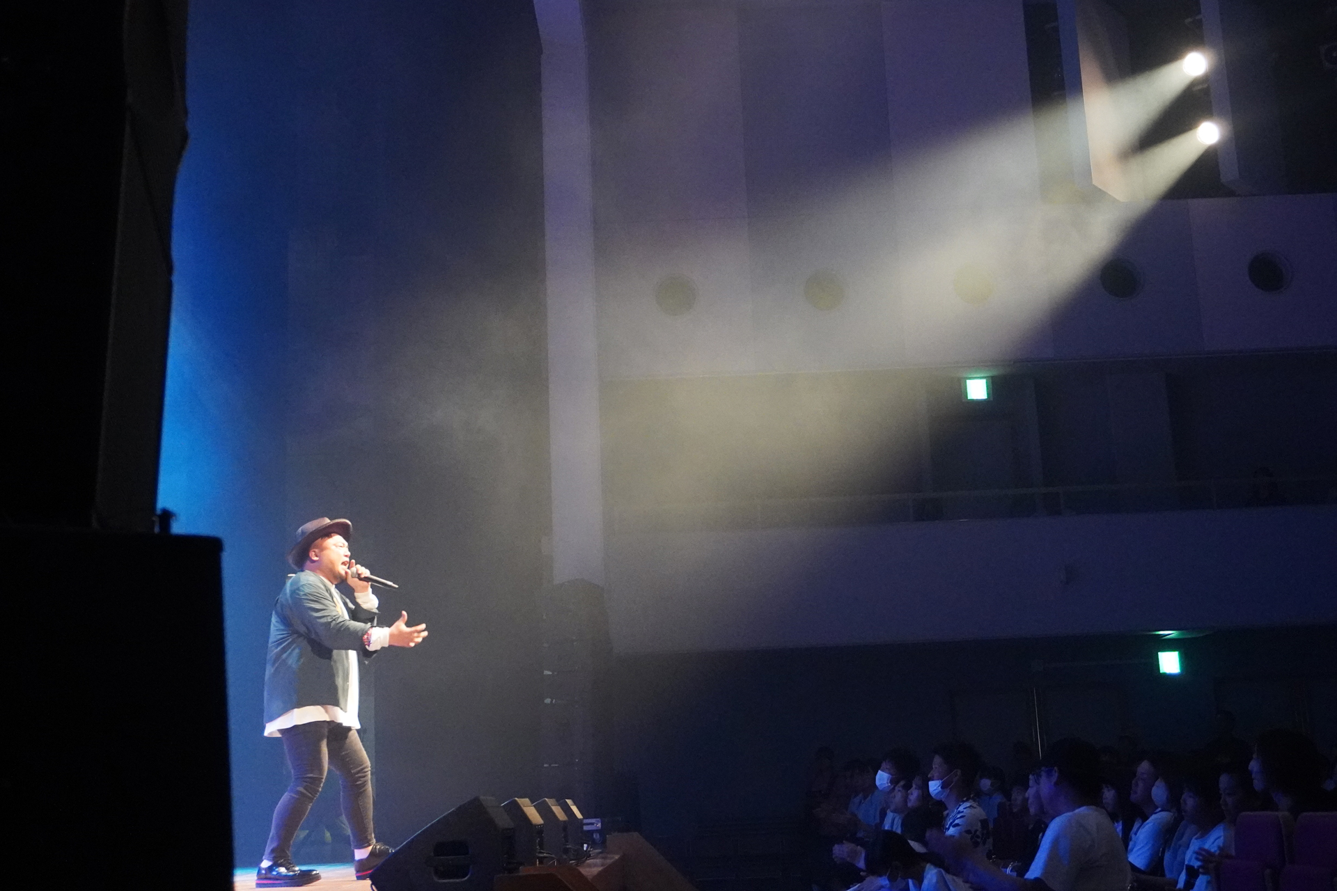 司会進行の岡田さんとせら坊がステージで諸注意を行います。
