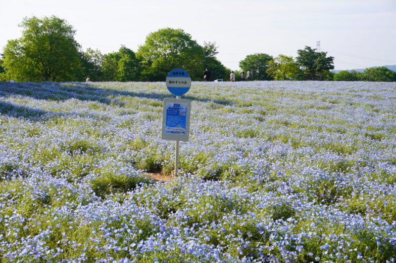 青いネモフィラの花畑にポツンと佇む小さなバス停は非日常を味わうことの出来るフォトスポットです。
