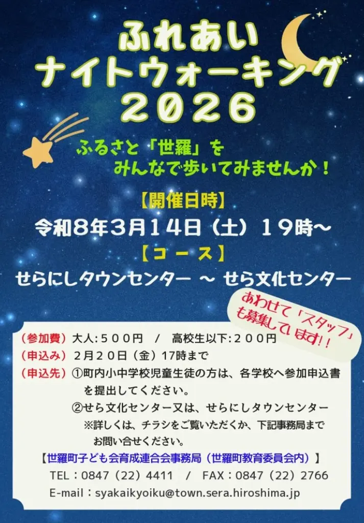 2026年3月14日(土)に世羅町子ども会育成連合会主催による「ふれあいナイトウォーキング2026」が開催されます。