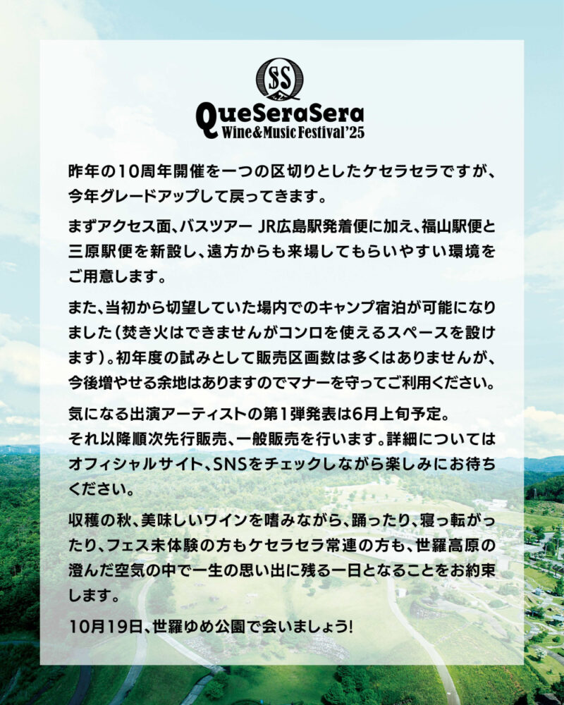 収穫の秋、美味しいワインを嗜みながら、踊ったり、寝っ転がったり、フェス未体験の方もケセラセラ常連の方も、世羅高原の澄んだ空気の中で一生の思い出に残る一日となることをお約束します。