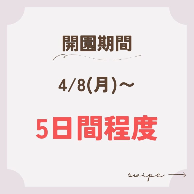 『桜の見頃が続くため5日間程度(4月12日頃まで)延長を予定しております。但し、天候や花の状況により早期終了する場合があります。SNSやHPをご確認の上、ご来園ください。』