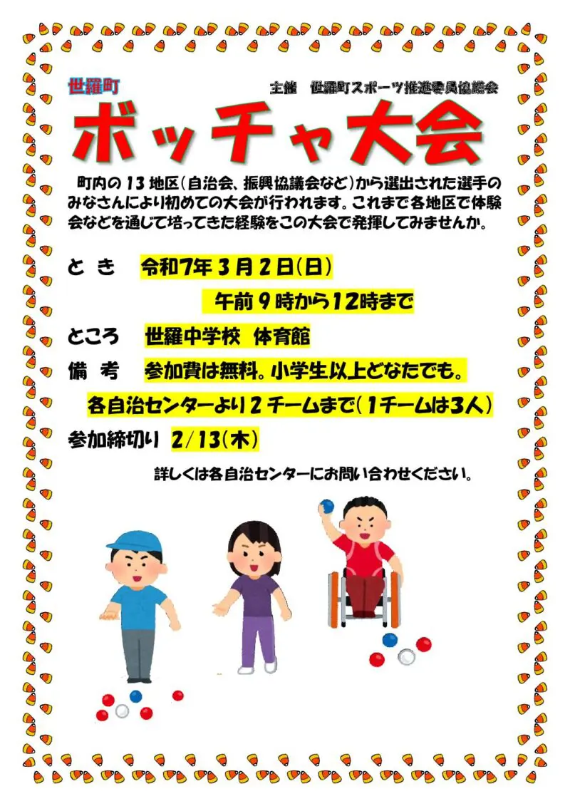 世羅町内13地区から選出された選手の皆さんによる、初めてのボッチャ大会が開催されます!