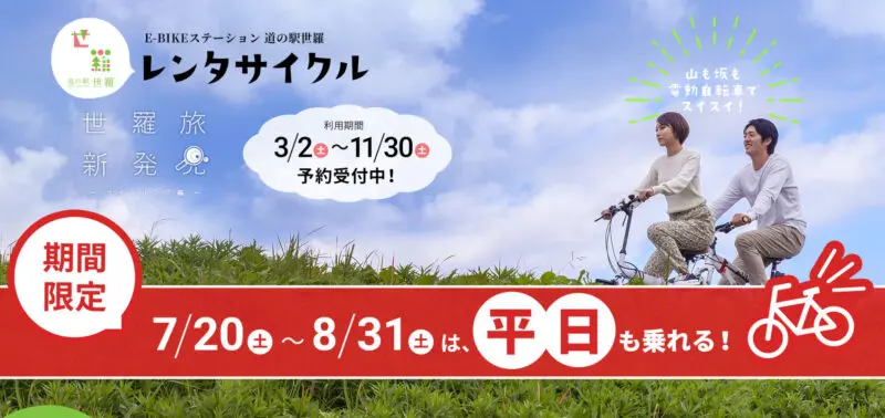 道の駅世羅で昨年スタートした電動アシスト付き自転車のレンタルですが、夏休みの間(7月20から8月31日まで)平日もレンタルが可能になります!
