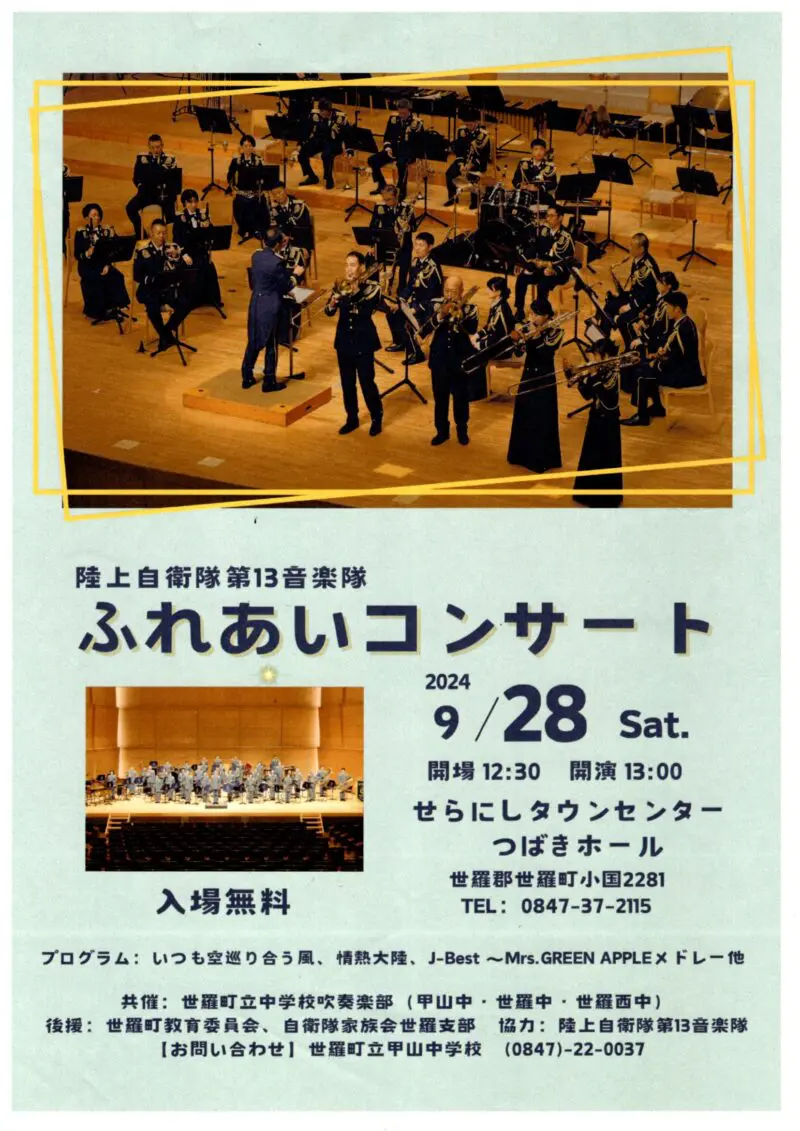 9月28日(土)、せらにしタウンセンターで陸上自衛隊第13音楽隊による「ふれあいコンサート」が開催されます。
