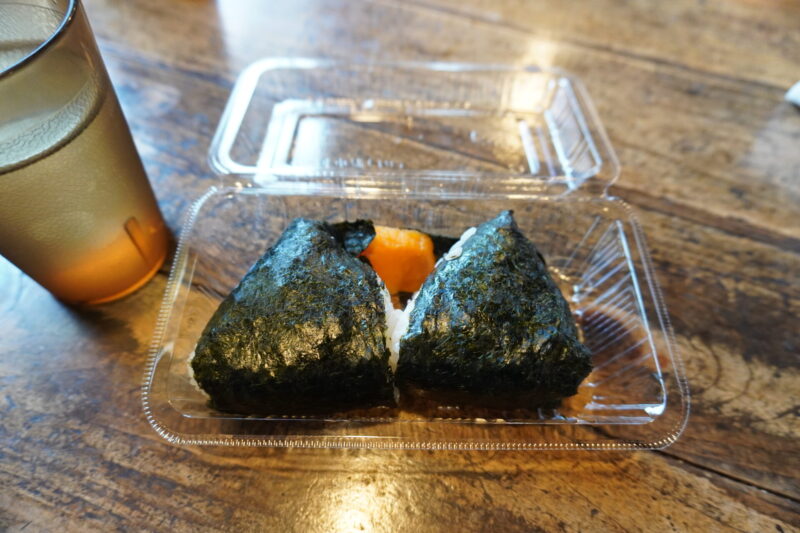 美味しいコシヒカリのおにぎりは何種類かある中で選ぶことができます。今回は鮭と高菜です。
