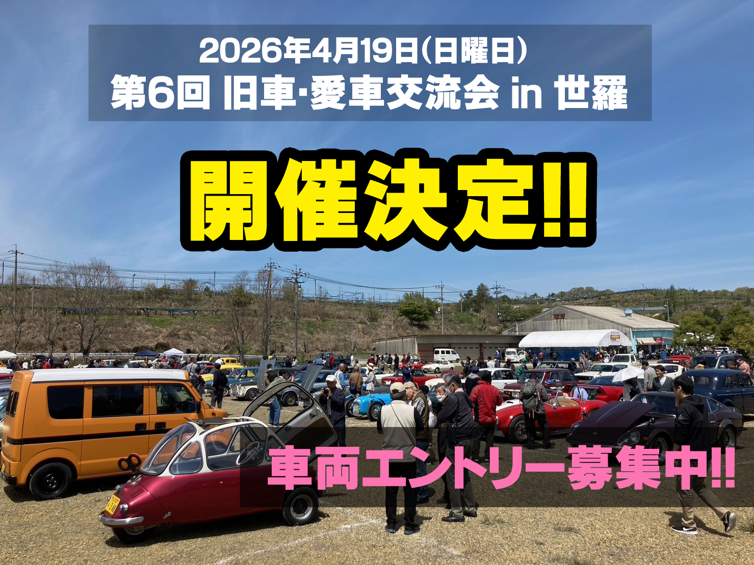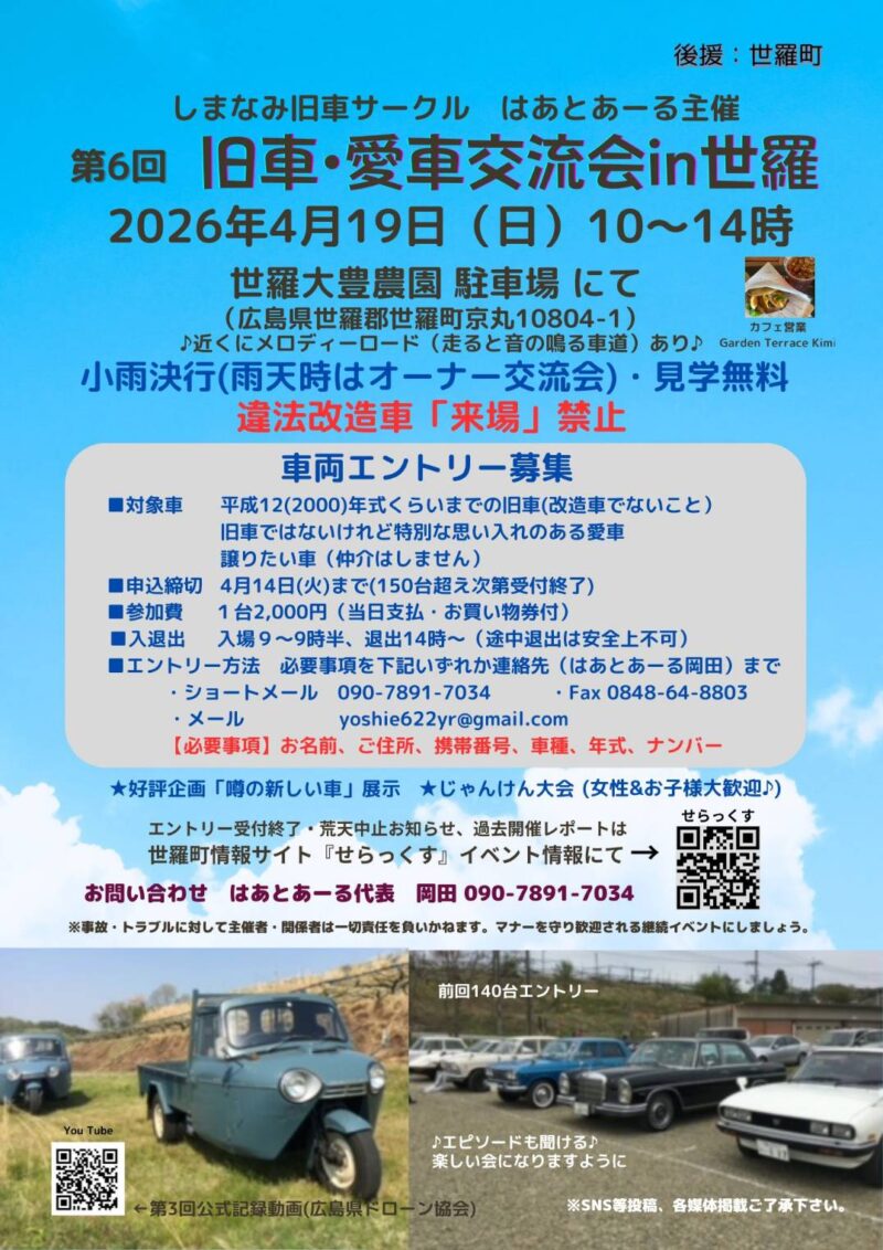 4月19日(日)、世羅町大豊農園で『第6回 旧車・愛車交流会 in 世羅』が開催されます。