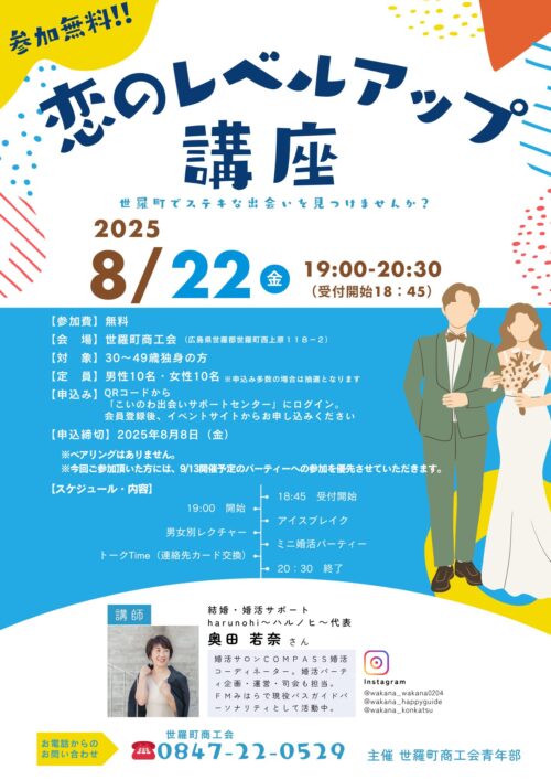 【8月22日(金)】参加無料 恋のレベルアップ講座【世羅町商工会青年部】<イベント告知>