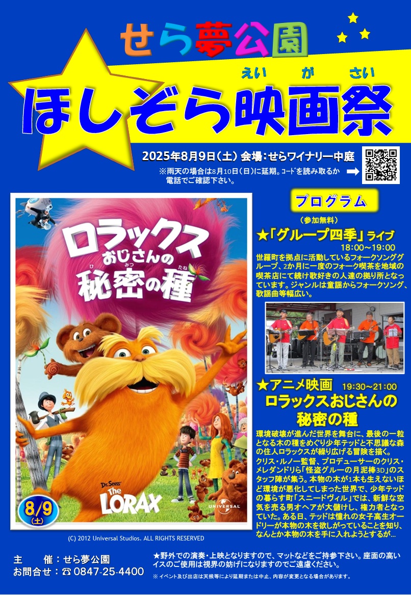 8月9日(土)、せら夢公園の恒例イベント「ほしぞら映画祭」が今年も開催されます。