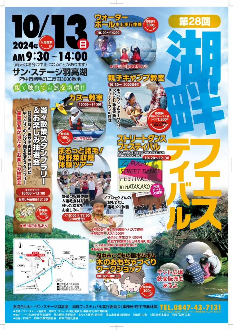 10月13日(日)9時30分から14時までサン・ステージ羽高湖で第28回湖畔フェスティバルが開催されます。様々な体験や教室に参加でき大人からお子様まで幅広く楽しめる内容となっております!