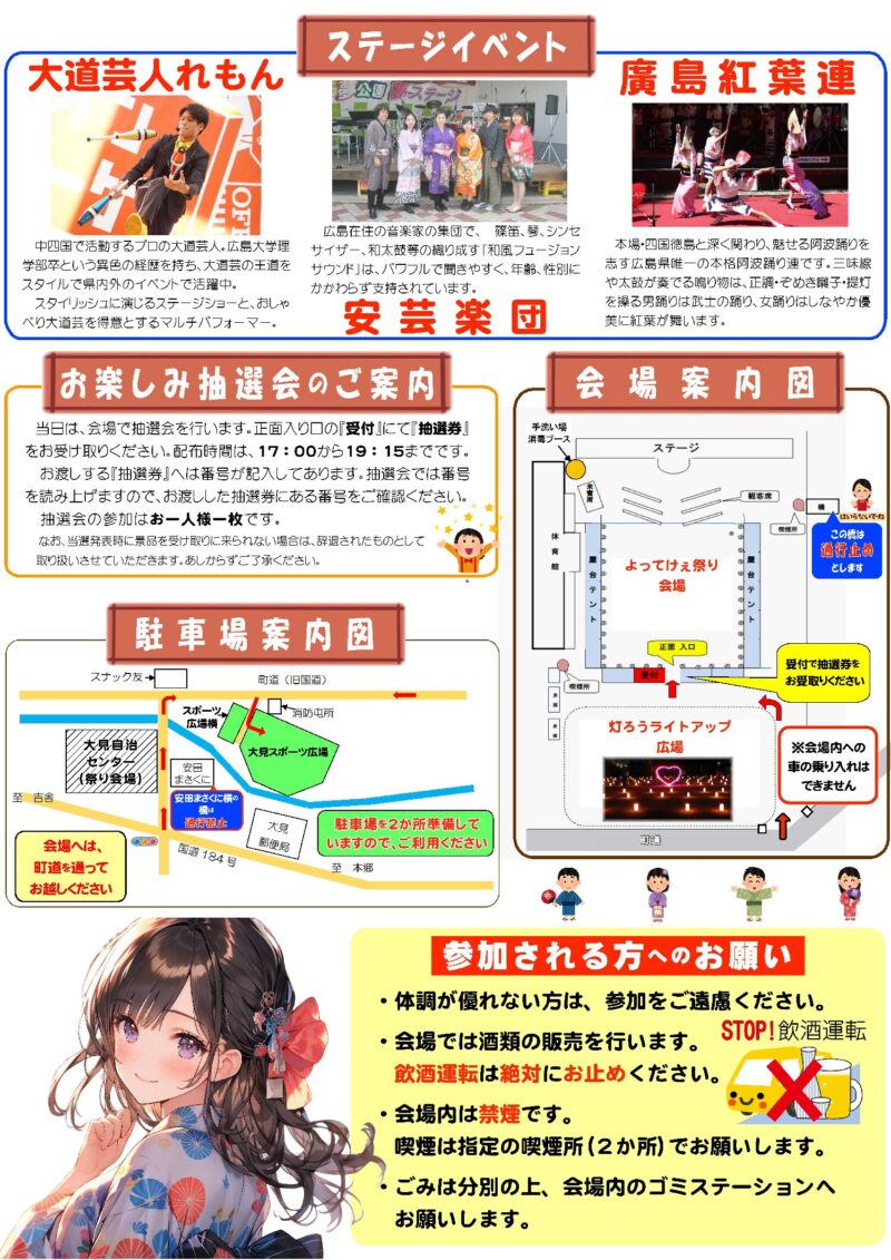 「大道芸人れもん」「安芸楽団」「廣島紅葉連」によるステージイベントがあります。