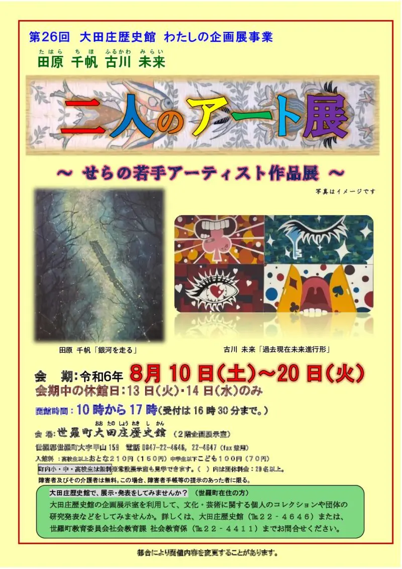 大田庄歴史館では、第26回わたしの企画展「二人のアート展」~せらの若手アーティスト作品展~を8月10日(土曜日)から8月20日(火曜日)まで開催します。