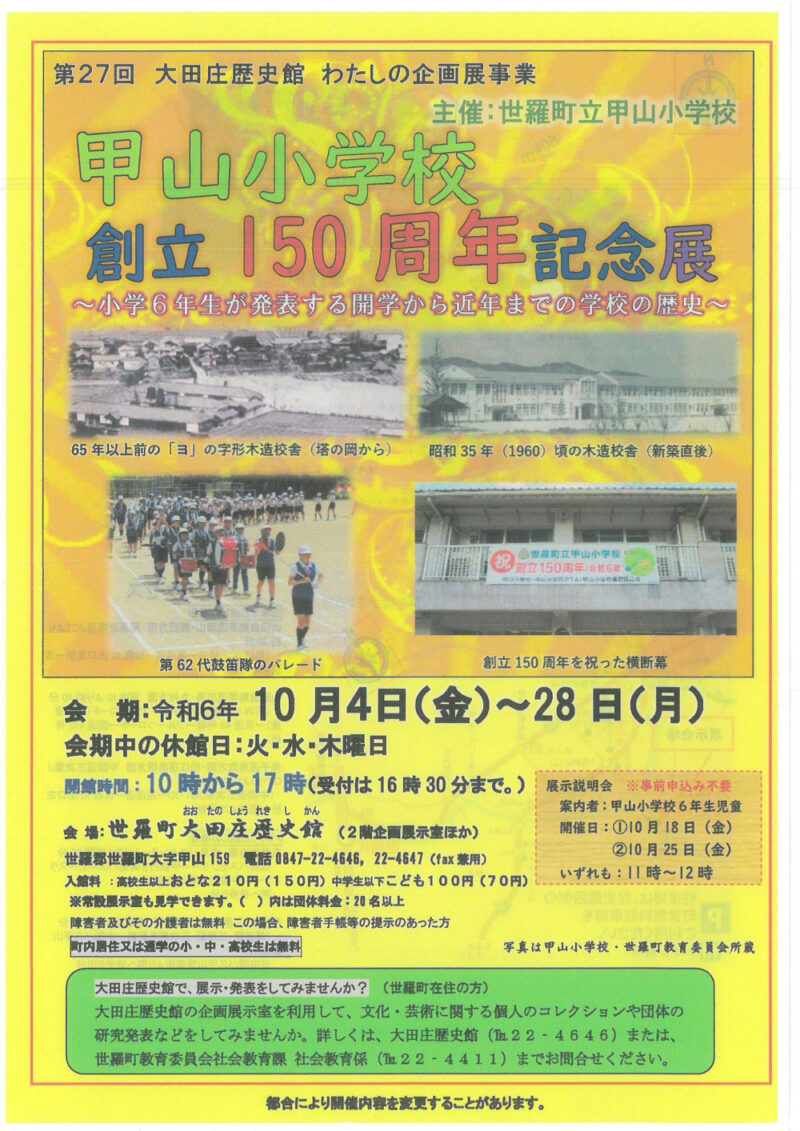 大田庄歴史館では、第27回わたしの企画展「甲山小学校創立150周年記念展」~小学6年生が発表する開学から近年までの学校の歴史~を10月4日(金曜日)から10月28日(月曜日)まで開催します。