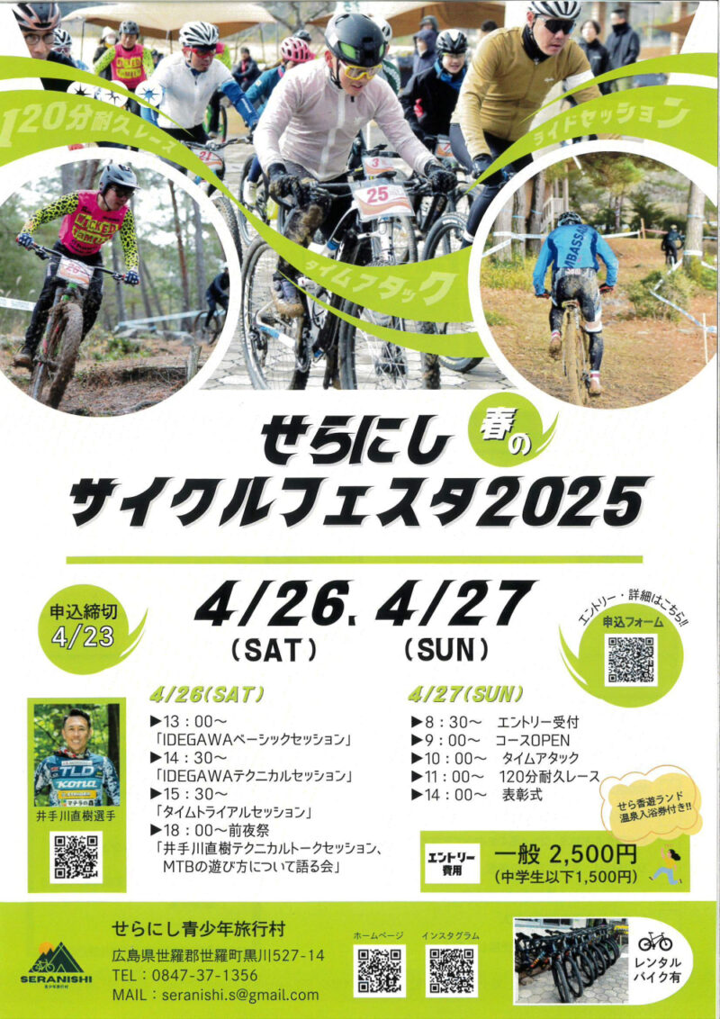 4月26日(土)・27日(日)の2日間、『せらにし春のサイクルフェスタ2025』がせらにし青少年旅行村にて開催されます!