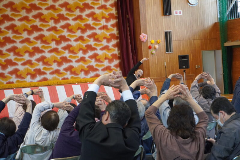 公演の合間に自治センター職員の佐々木さんが、座ったまま出来るストレッチを指導されました。佐々木さんはフィットネスインストラクターの経験も有り、無理のない手軽なストレッチを披露されていました。