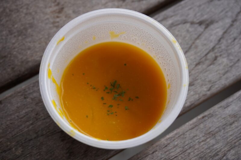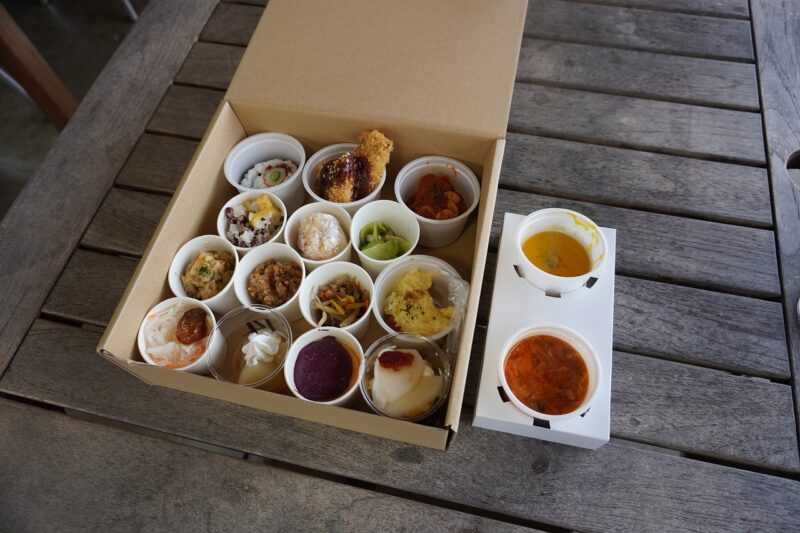 受付でお弁当をゲット!ずっしりと重い箱と2種類のスープを受け取りました!楽しみです!