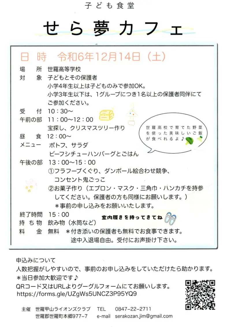 世羅甲山ライオンズクラブと世羅高校がタックを組んで「せら夢カフェ」を開催します。