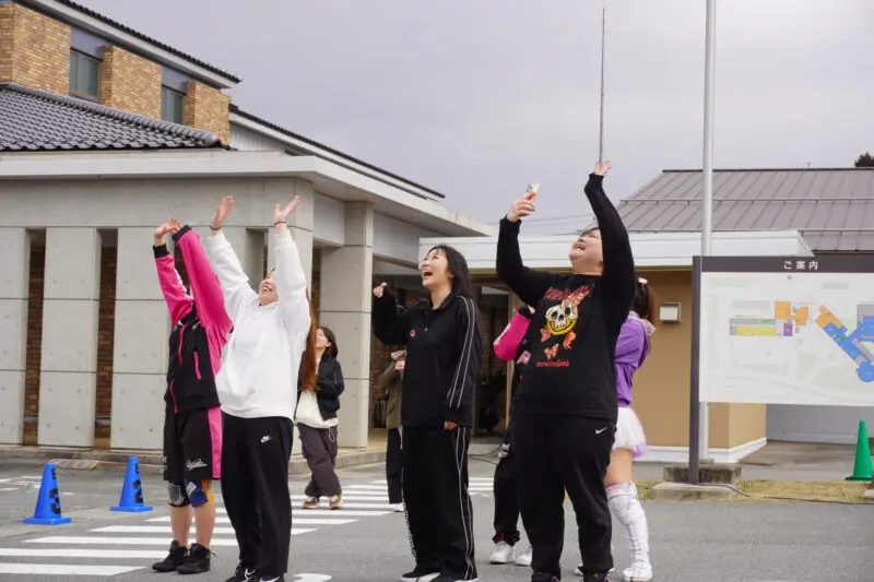試合前の世羅りさ選手と美蘭選手も乗り込みます!美蘭選手は余裕のピースサインですが、世羅りさ選手は高い所が苦手なご様子です。しかし何事もチャレンジ!強張った笑顔が彼女の不安を炙り出します。世羅りさのウイークポイント発見か!?