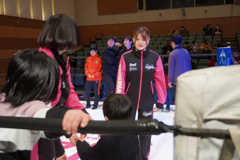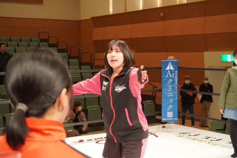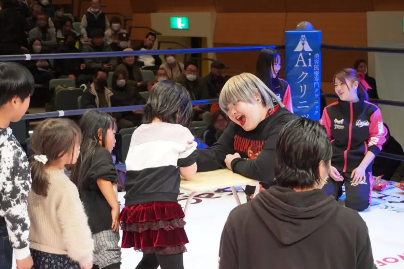 子供たちがプロミネンスの柊くるみ選手と腕相撲で対決!