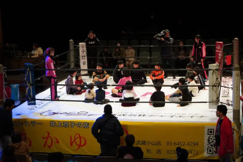 実際のリングに上がれるだけでも貴重な体験です。しかも現役レスラーの直接指導!参加したお子さんは大変ラッキーでした。自分も一緒に転がってみたい!