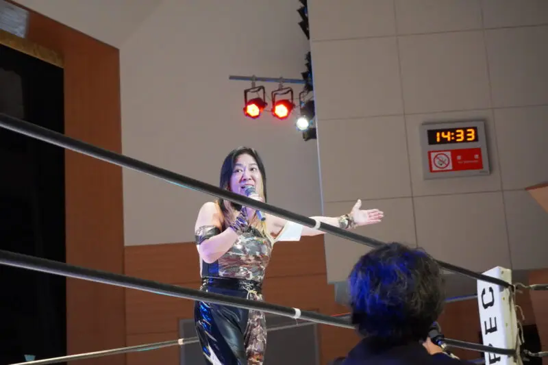 各選手が入場するごとに大歓声が起こります。特にレジェンドのお二人、井上京子選手とジャガー横田選手の登場は、歓声とは違ったどよめきが混ざった声が巻き起こりました!