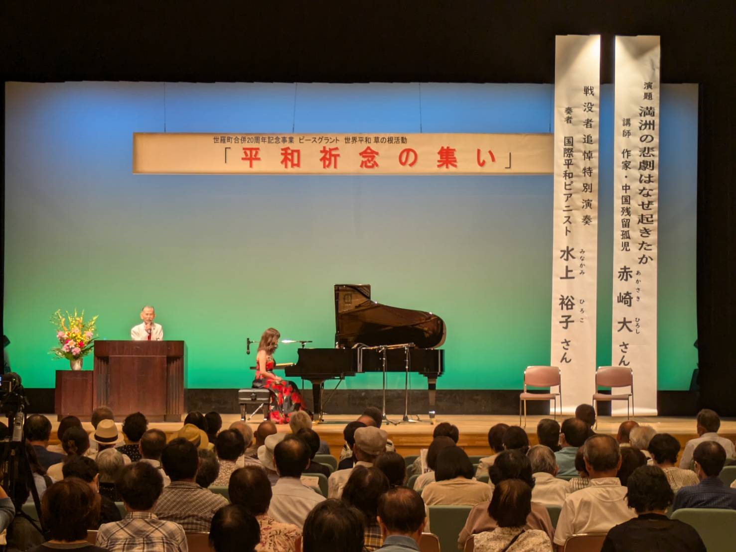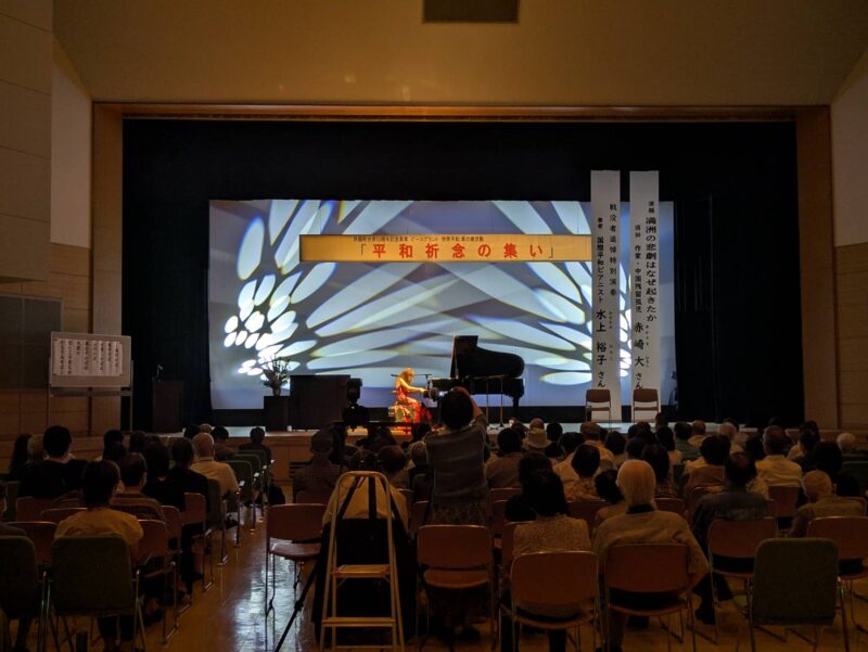平和を目指す活動ということで今回の講演会が開かれました。第一部では作家の赤崎大(あかさき ひろし)さんの講演が行われ第二部では、国際平和ピアニストの水上裕子(みなかみ ひろこ)さんの演奏がありました。