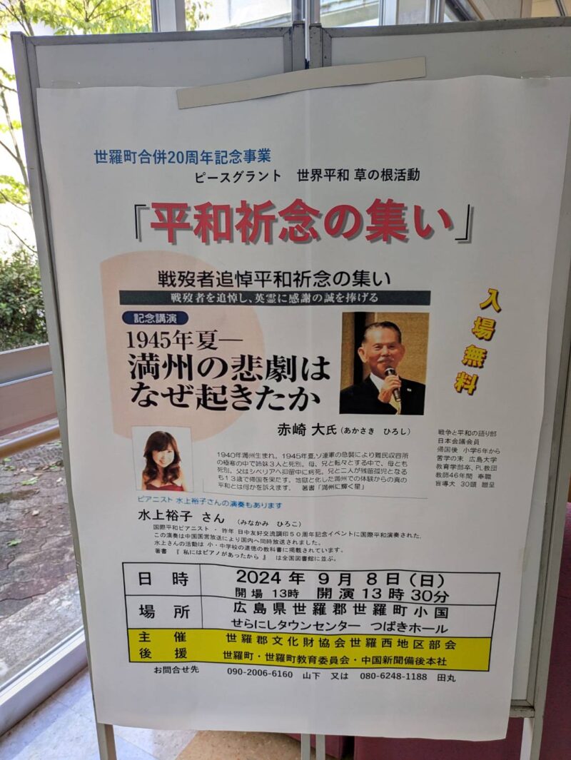 みなさんこんにちは。今回は9月8日に世羅町せらにしタウンセンターで「平和祈念の集い」が開催されましたので紹介したいと思います。