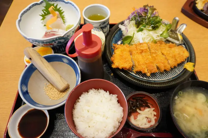 世羅高原豚のロースカツ・お刺身・茶碗蒸し・ご飯・味噌汁・香の物・デザート