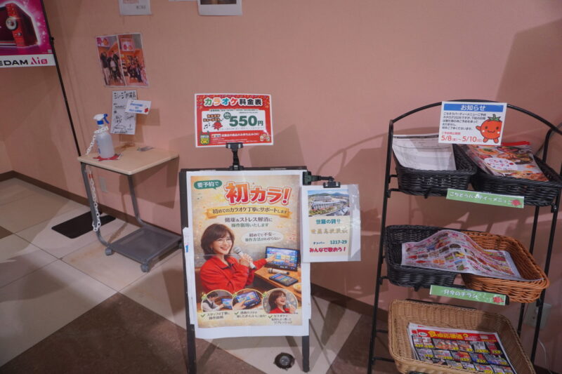 店舗入り口には早速「健康カラオケ」ののぼりがあります。