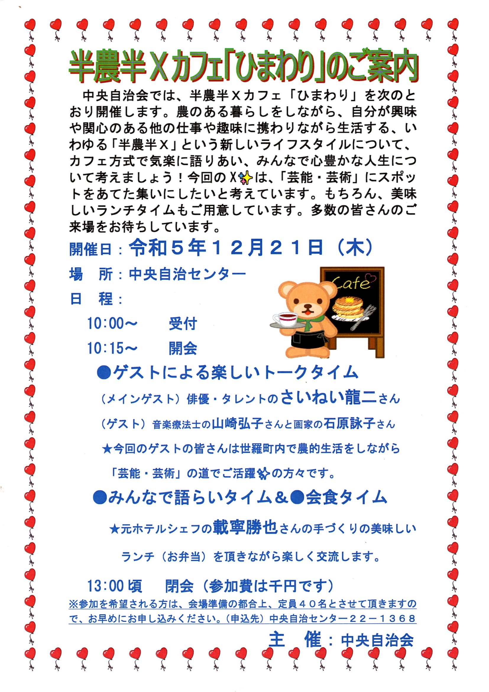 カフェ方式で「半農半X」いついて気楽に語り合い、みんなで心豊かな人生について考えましょう!