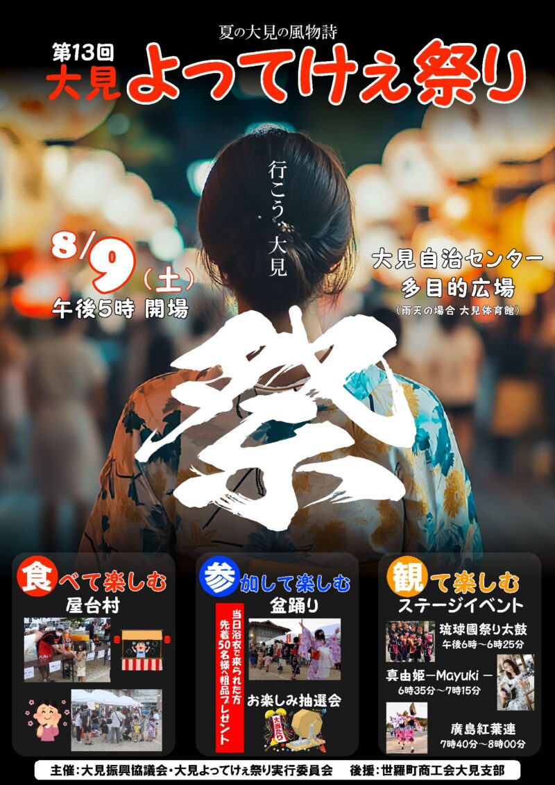 8月9日(土)17時から、世羅町大見地区の夏の風物詩となっている「大見よってけぇ祭り」が開催されます!ステージイベントや盆踊り、屋台にお楽しみ抽選会と盛り沢山な内容です。下記内容をご確認の上、是非ご参加下さい!! ステージイベント 琉球國祭り太鼓 ... -