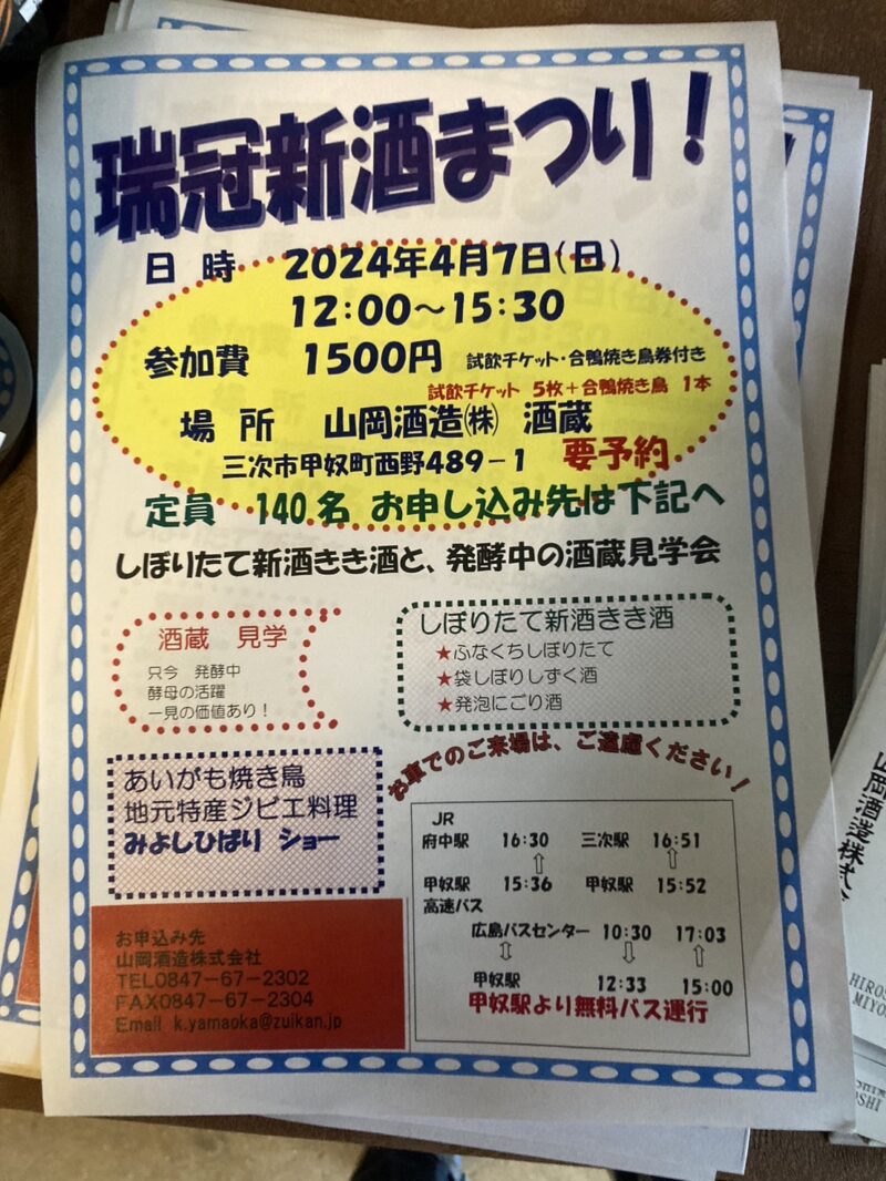 世羅町民が大変お世話になっている山岡酒造さん。その銘酒「瑞冠」の新酒と酒蔵見学が楽しめます。発酵途中のタンクを見学できるまたとない機会です!