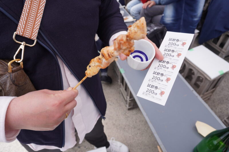 お会計1,200円を支払うと、試飲券1,000円分とおちょこ、そしてあいがも焼き鳥が1本ついてきます。